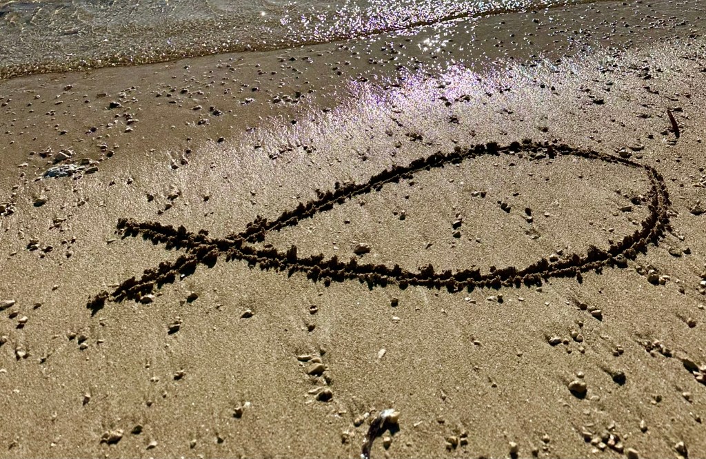 I hope you like my fish drawing in the sand. It took me a while. The first one was washed away by a rogue wave, and one of Sammy’s doggie friends ran through the second one. The third turned out ok.
