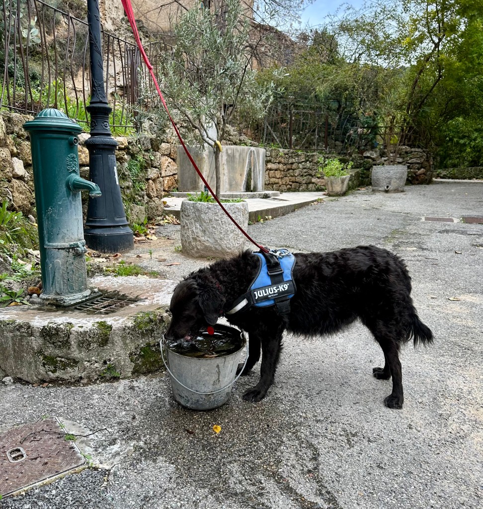 Last weekend, we visited a small village in the Languedoc region of Southern France. On a little street was a water fountain. Sammy was thirsty, and with a few pumps, Stéfane filled the metal bucket to the brim. Instead of charging in and drinking deeply, Sammy approached it cautiously. He thoroughly sniffed the outside of the bucket, from top to bottom, the handle, then the water. Satisfied it was good, he lapped it up eagerly.